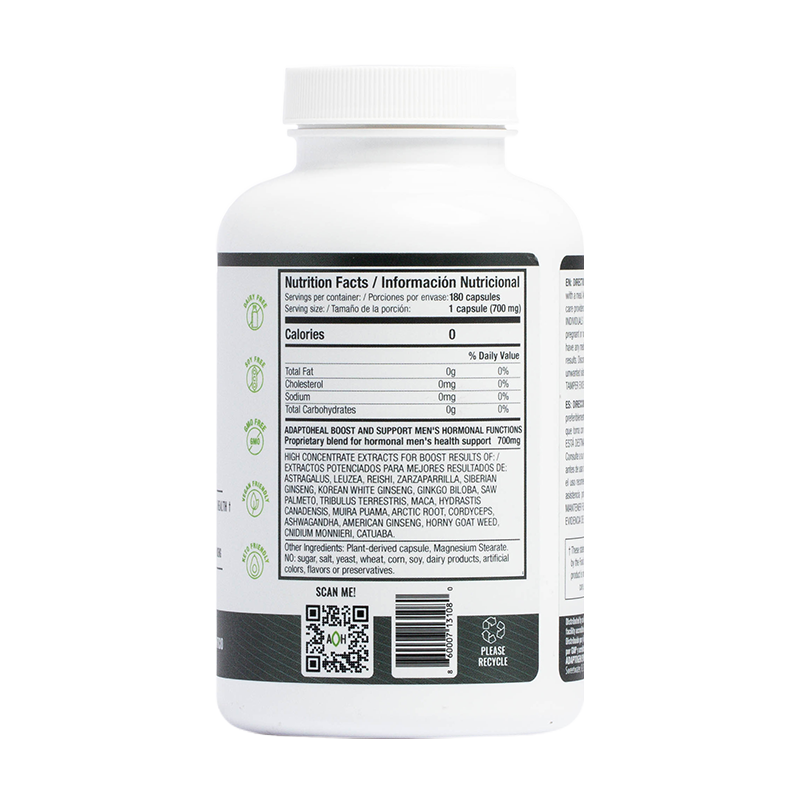 Astragalus, Leuzea, Reishi, Zarzaparrilla, Siberian Ginseng, Korean White Ginseng, Ginkgo Biloba, Saw Palmeto, Tribulus Terrestris, Maca, Hydrastis Canadensis, Muira Puama, Artic Root, Cordyceps, Ashwagandha, American Ginseng, Horny Goat Weed, Cnidium Monnieri, Catuaba